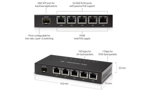 EdgeRouter X-SFP (ER-X-SFP) je vhodný všude tam, kde je nutné směrovat velké množství dat, do malých i středních firem a všude kde je kladen důraz na bezpečnost sítě. EdgeRouter X-SFP je výkonný router od známého výrobce Ubiquiti z produktové řady EdgeMAX. Je vybaven 5x Gigabitovými ethernetovými porty a dvou-jádrovým procesorem MIPS 1004KC. Velkou předností EdgeRouter X-SFP je SFP port pomocí něhož lze snadno připojit a vzdálenější body pomocí optické trasy.