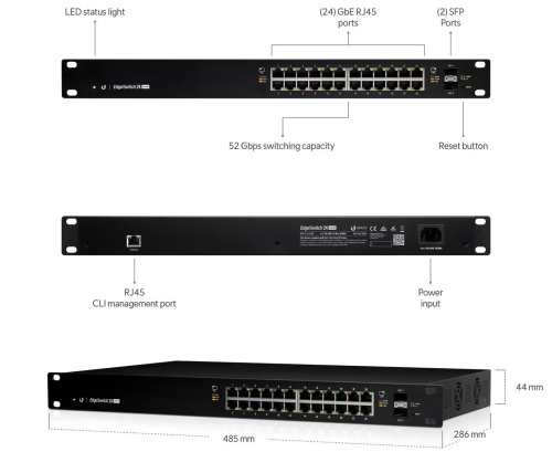 PŘEHLED Gigabitový L3 PoE switch Ubiquiti EdgeSwitch ES-24-250W v 19" rackmount provedení s maximálním výkonem PoE napájení 250W. Managovatelný switch s 24 gigabit metalickými porty + 2 gigabitové SFP porty a celkovou propustností 26Gbps. PoE na každém portu je možné nastavit jako aktivní PoE 802.3af/at nebo pasivně 24V s maximálním výkonem34W/port.