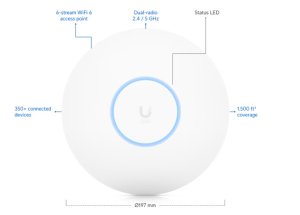 UniFi Access Point WiFi 6 Pro (U6-Pro) je vysoce výkonný Dual-band WiFi 6 Access Point a je ideální pro domácí a kancelářské použití. U6-Proje schopen dosáhnout skvělých propustností - v pásmu 5GHz (4x4 MU-MIMO) je to 4800Mb/s při použití se 160MHz šířkou pásma a ve 2,4GHz (2x2MIMO) je to 573,5Mb/s, což mu umožňuje podporovat více než 300 současně připojených klientů. Díky nenápadnému designu zapadne do jakéhokoliv prostředí a vzhledem k provedení s ochranou IP54je možné jej kromě vnitřních instalací použít částečně i v exteriéru. Access Point má Gigabitový ethernet s podporou aktivního PoE (802.3at) ale i pasivního 44 až 57V PoE.