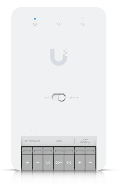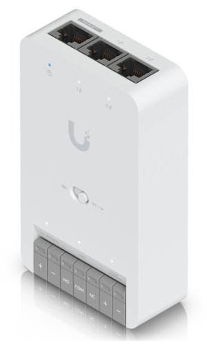 1) UA-Hub-Door-Mini Rozhraní: 3× GbE RJ-45 Podpora PoE: ano, 1× PoE++ vstup DC 50 V / 1 A, 2× PoE výstup (dohromady 31 W) Spotřeba: 19 W (50 W při použití PoE výstupů) Výstupy relé: Dry: DC 30 V / 1 A Wet: DC 12 V / 1 A Hmotnost: 190 g Rozměry: 113 × 66 × 27,6 mm