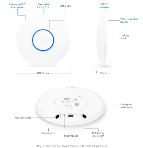 Frekvence [GHz]: 2,4 + 5 Gigabit LAN: Ano LAN: (2) 10/100/1000Mbps Max. spotřeba energie [W]: 9 Napájení přes PoE: 802.3at Napájení přes PoE: 44 .. 57V DC Operační mód: Access Point Počet LAN portů: 2 Bluetooth: Ano Počet vestavěných antén: 3 Podpora IPv6: Transparentní (režim bridge) PoE: VstupníProvozní teplota [°C]: -10 až 70 Přenosová rychlost WiFi - 2,4GHz [Mb/s]: 450 Přenosová rychlost WiFi - 5GHz [Mb/s]: 1300 Výstupní výkon 2,4GHz [dBm]: 22 Výstupní výkon 5GHz [dBm]: 22 Roaming: Ano Šifrování: WEP, WPA-PSK, WPA-Enterprise (WPA/WPA2,TKIP/AES) Tlačítka: Reset Typ antény: Vestavěná Výchozí IP adresa: Dynamická z DHCP Výchozí jméno a heslo: Ubiquiti/Ubiquiti WiFi standardy: 802.11ac, 802.11n, 802.11a, 802.11b, 802.11g Zisk antény [dBi]: 3 Šířka [mm]: 197 Výška [mm]: 35 Hloubka [mm]: 197 Hmotnost [g]: 350