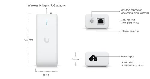 Technické specifikace Rozměry: 130 x 55 x 34 mm Hmotnost: 200 g Materiál pouzdra: Polykarbonát Montážní materiál: Polykarbonát Rozhraní pro správu: WiFi Síťové rozhraní: 1x Port GbE RJ45 PoE rozhraní: 1x Pasivní PoE výstup Tlačítko: 1x Obnovení továrního nastavení LED: 4x Modrá - signál, 1x Bílá/modrá - indikátor Metoda napájení: 100–240 V AC, 0,45 A Max., 50/60 Hz Max. spotřeba energie: AC vstup - 25W, Bez PoE výstupu - 10W Max. PoE výkon na port: 15W Podporovaný rozsah napětí: 100—240V AC WiFi standardy: 802.11a/n/ac Max. TX výkon: 5 GHz - 21 dBm MIMO: 5 GHz - 2 x 2 Max. datová rychlost: 5 GHz - 866,7 Mbps (BW80) Zisk antény: 5 GHz - Interní anténa: 5 dBi / Externí všesměrová anténa: 4 dBi Anténa: 1x Interní anténa, 1x Konektor RP-SMA pro externí všesměrovou anténu Montáž: Stěna Okolní provozní teplota: -10 až 40 °C Okolní provozní vlhkost: 5 až 95 % nekondenzující Podporované přenosové rychlosti: