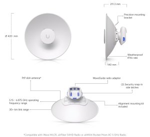 Ubiquiti UISP Dish Mini Technické specifikace Rozměry: * Anténní talíř: 420 x 140 mm * Anténní talíř s vlnovodem: 420 x 211,3 mm Hmotnost: * Anténní talíř: 1,95 kg * Držák: 1 kg * Vlnovod: 0,45 kg Materiál …