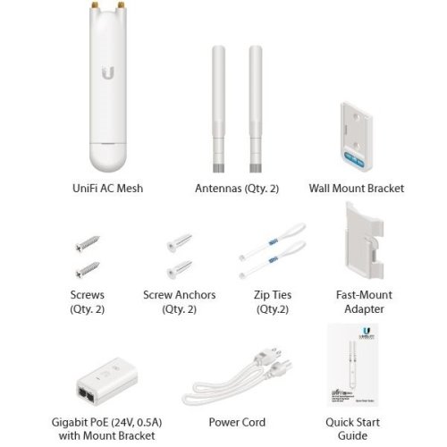UniFi AC Mesh má dvě voděodolné všesměrové odnímatelné antény pro pásmo 2,4 GHz (3 dBi) a 5 GHz (4 dBi), které je možné v případě potřeby nahradit anténou UniFi UMA-D a zvýšit dosah signálu.