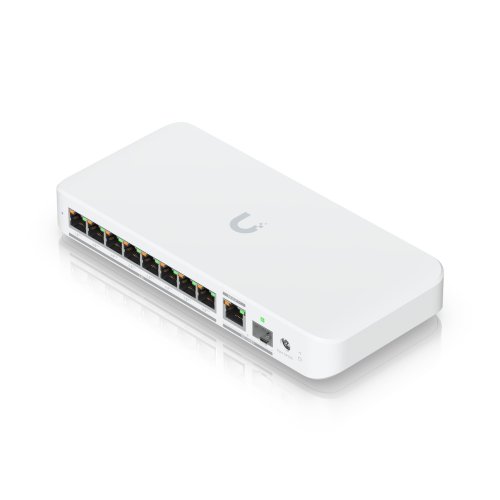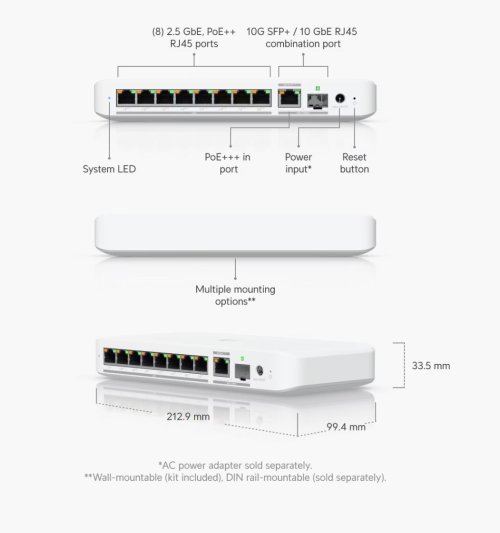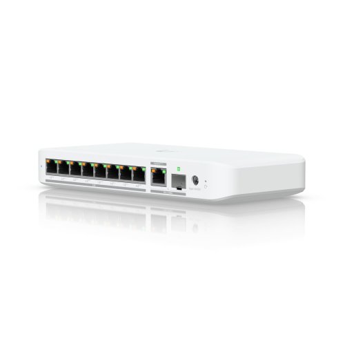 Flexibilní 8portový 2,5 GbE PoE++ switch s kombinovaným uplinkovým portem 10 GbE RJ45/SFP+, který lze napájet pomocí PoE+++ nebo napájecího adaptéru**.