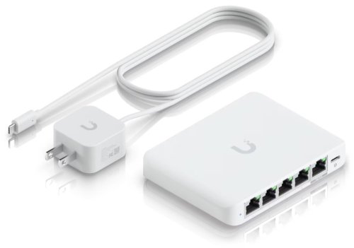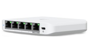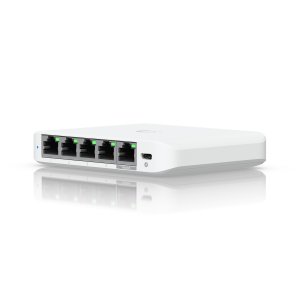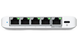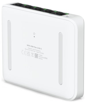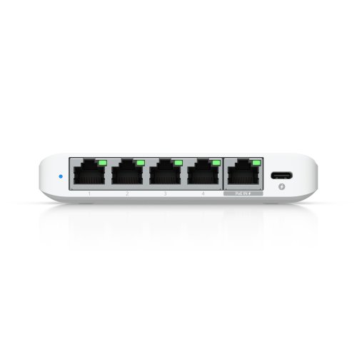 UniFi Flex Mini 2,5G kompaktní 5portový 2,5G switch, který lze napájet pomocí PoE nebo adaptéru USB-C