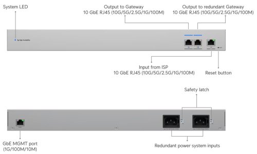 Porty: 1× 10GbE RJ-45 ISP uplink, 2× 10GbE RJ-45 downlink, 1× GbE RJ-45