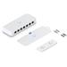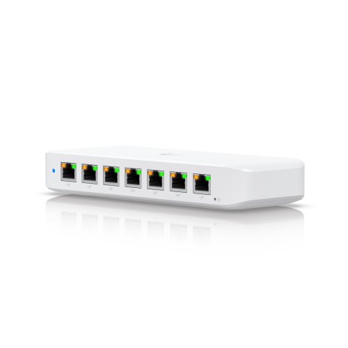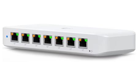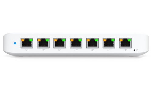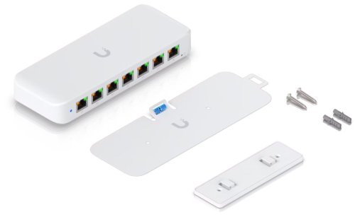 UniFi Switch Ultra je osazen sedmi výstupními GbE PoE+ RJ-45 porty a jedním vstupním GbE PoE++ RJ-45 portem. Jedná se o L2 switch s celkovou kapacitou 16 Gbps, neblokovanou propustností 8 Gbps a PoE budgetem až 202 W (v závislosti na typu napájení). Switch lze napájet buď přes DC konektor (54 V DC), nebo přes PoE++ (802.3at/bt) vstup na zadní straně. Díky přiloženému držáku jej lze snadno upevnit na stěnu.