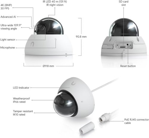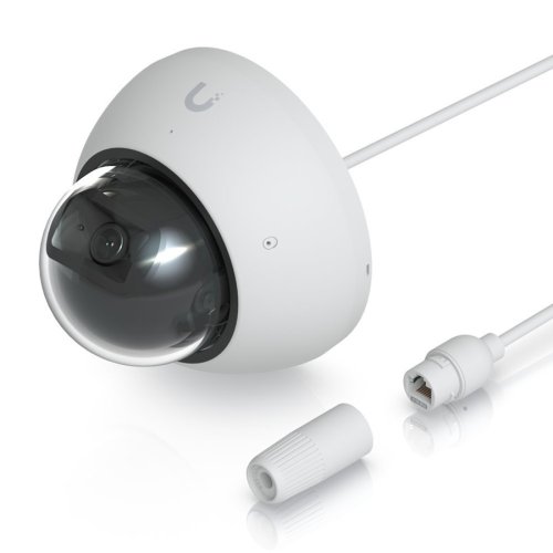 Ubiquiti UniFi AI Dome Venkovní 4K PoE Dome kamera s pokročilou AI pro rozpoznávání osob a registračních značek, s dlouhým dosahem nočního IR vidění a ochranou vůči nepříznivému počasí. Kamera snímá 8 Mpx video (3840 x 2160) při 30 snímcích za sekundu s fixním 2,8mm objektivem.