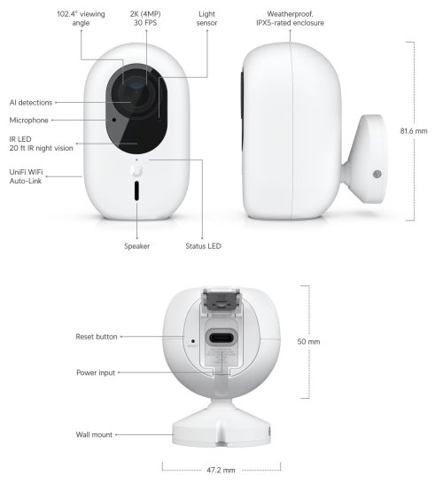 Rozměry: 81,6x50x47,2mm Hmotnost: 125g (bez montáže)|163g (s montáží) Senzor: 5MP CMOS sensor Čočka: Fixed focal length EFL 2,8mm, f/1,6 Zorný úhel: H: 102,4°, V: 54,9°, D: 120,6° Komprese: H.264/MJPEG Rozlišení: 2688x1512 (16:9) Procesor: Dual core Arm Cortex-A7 based chip Paměť: 2GB DDR3 Ovládání: UniFi Protect Síťové rozhraní: 802.11 a/b/g/n/ac WiFi|Bluetooth Maximální spotřeba: 6W