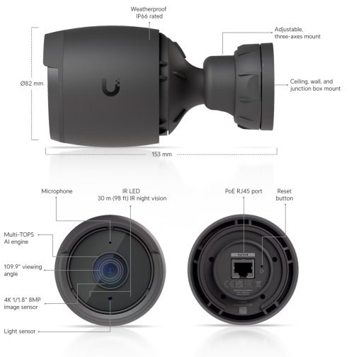 Hardware Max. Spotřeba energie: 9,9W Podporovaný rozsah napětí: 37–57 V DC Metoda napájení: PoE Procesor: Čtyřjádrový čip založený na Arm® Cortex®-A53 Průměr pro montáž na sloup: 38–50 mm Hmotnost:
