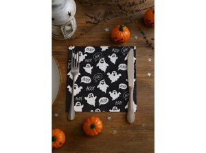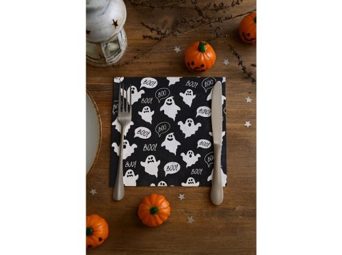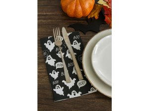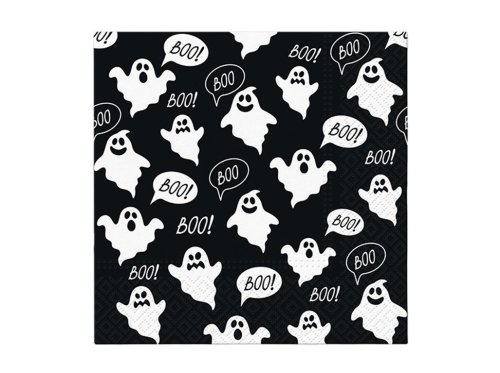 Stylové černo-bílé ubrousky s jednoduchým, moderním designem „Boo“. Ideální na stylové Halloween párty nebo dekorace stolu. Rozměr 33 × 33 cm, 3 vrstvy, 20 kusů.