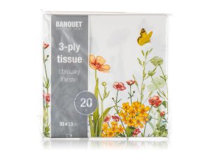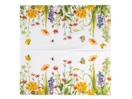 Ubrousky 33 x 33 cm, MEADOW, 3vrstvé (20 ks). rozměry: 33 x 33 cm balení: 20 ks Papírové jídelní ubrousky MEADOW s dekorem rozkvetlé louky, 3vrstvé.