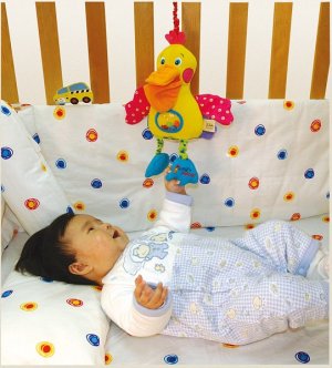 Pelikán k zavěšení na kočárek nebo postýlku je vhodný již od raného dětství, kdy díky tomu, že je ušitý z různých materiálů, podporuje vizuální hmatové i sluchové vjemy dítka. Při pohmatu šustí a chrastí a zároven dítě vnímá hmatem různé typy povrchů.