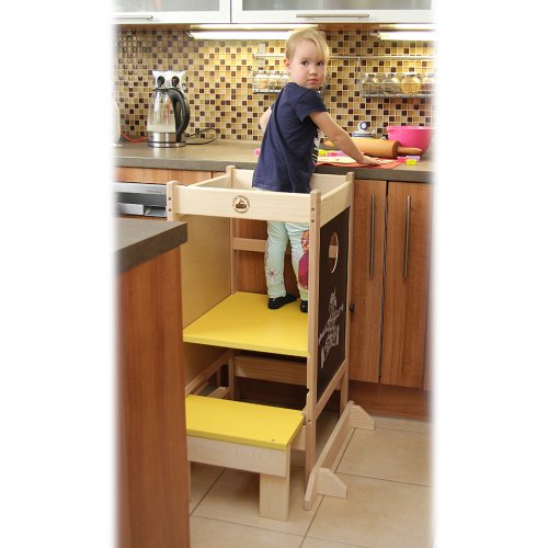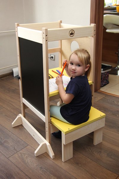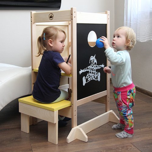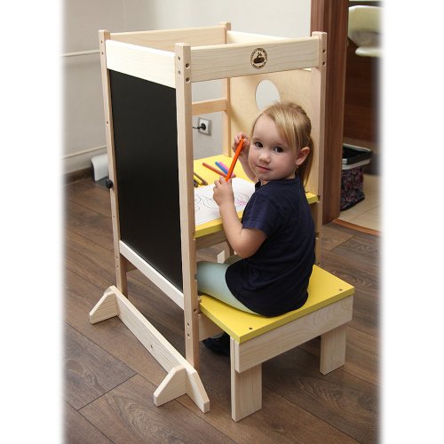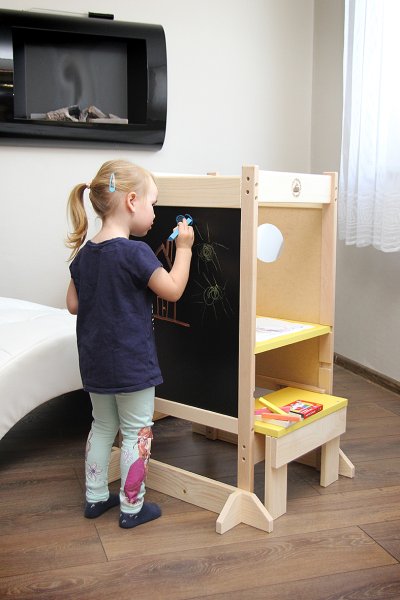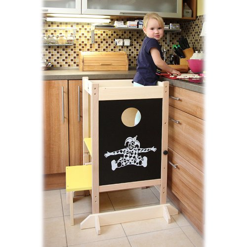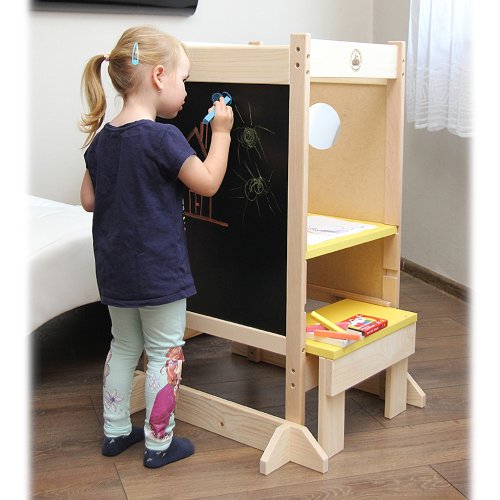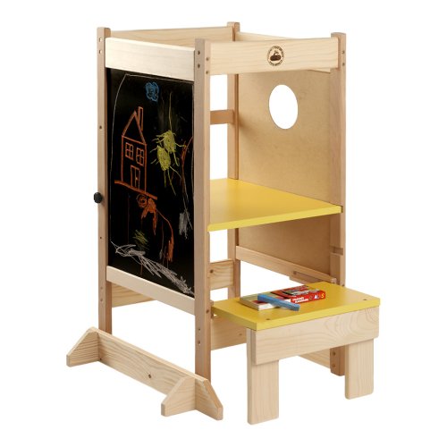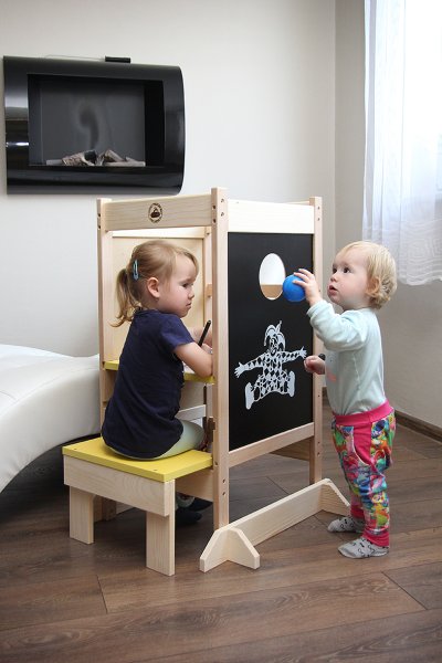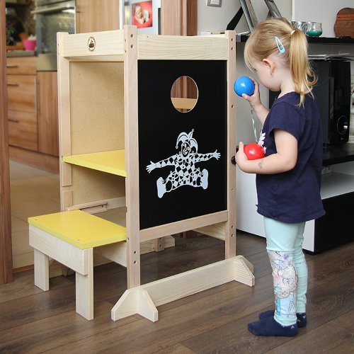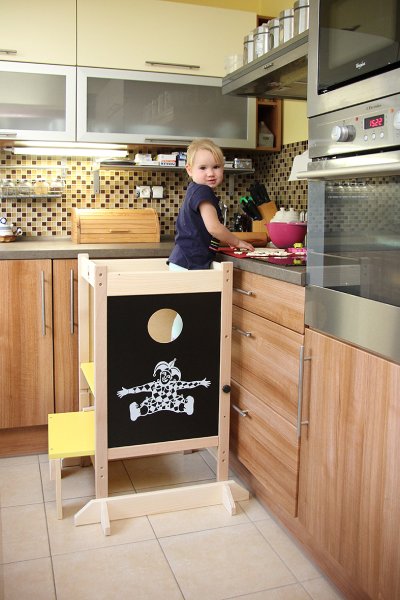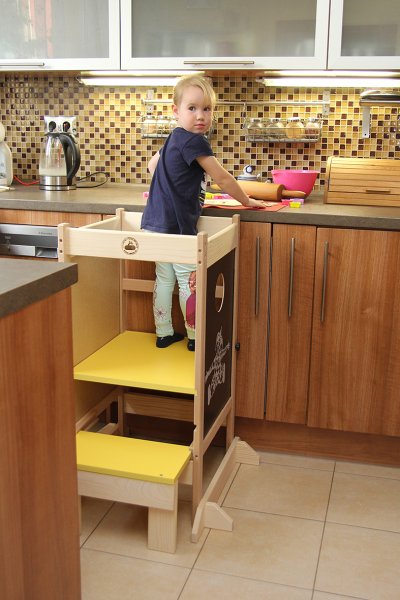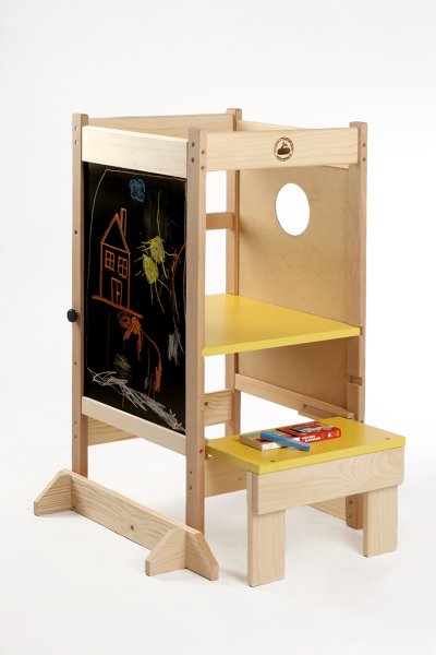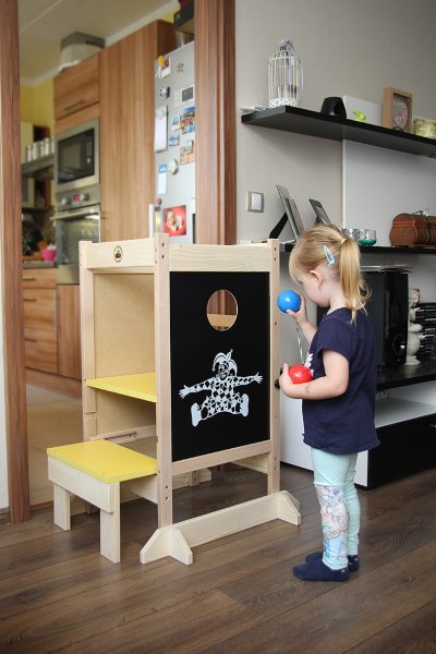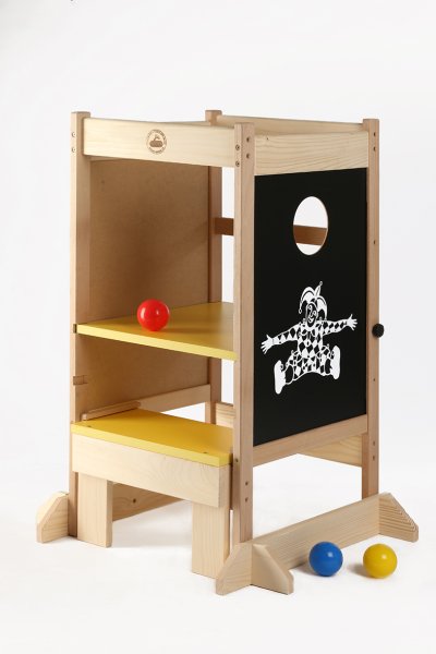 Učicí věž je víceúčelová stolička pro Vaše děti. Je vyrobená z kombinace bukového a smrkového dřeva. Umožňuje dítěti zapojit se do různých tvořivých činností u kuchyňské linky či pracovního stolu. Práce na kuchyňské lince zdokonaluje dítěti motorické schopnosti, a máte dítě neustále pod kontrolou. Věž dětem umožní být v úrovni pracovní desky, vidět vše, co děláte a tvořit s Vámi. Učicí věž se skládá ze stojací plochy, na které dítě stojí, schůdku, po kterém se na ni dostane a z ohrádky okolo. Při používání nenechávejte učicí věž v prostoru, ale vždy věž umístněte stranou naproti schůdku k pevné překážce (kuchyňská linka apod.). Víceúčelová stolička se používá jako: stojací věž-dvě výškové polohy stoleček se židličkou kreslící tabule na křídyzábavná tabule s klaunem s možností prohazování míčků Upozornění:Prodejem učící věže nepřebíráme odpovědnost za bezpečnost dítěte. Dítě na učící věži musí být pod stálým dozorem dospělé osoby! Hlavní vlastnosti: zdokonaluje motorické schopnostiodolná konstrukce, multifunkčnívyrobeno v české republice