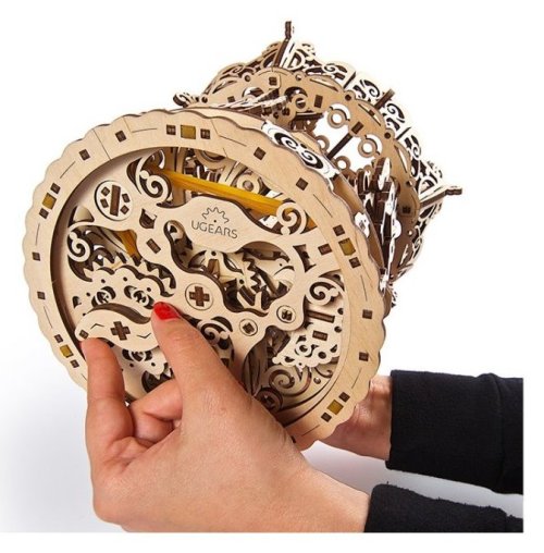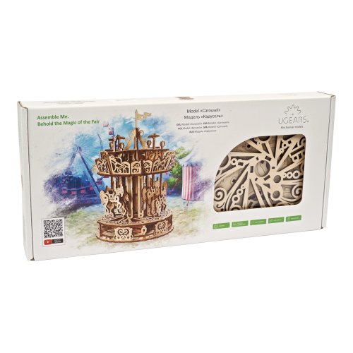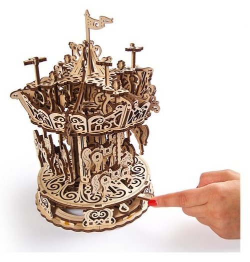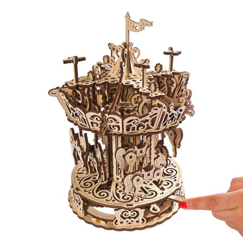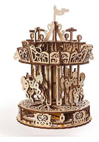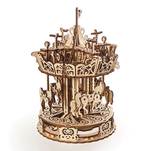 Kouzlo vzpomínek na dětství! Stavebnice kolotoče vyrobená z překližky. Nechejte se unést atmosférou pouti a odpočiňte si od každodenního shonu při stavbě propracovaného modelu klasického kolotoče s koníky. Je vybaven natahovacím pohonem s gumovými pásky, opatřeným jednoduchou spouští. Jeho pomocí můžete rozehrát důmyslný mechanismus umně dotvořený drobnými detaily, které z pohybu kolotoče dělají zvláště poutavou atrakci. Protiběžné otáčení středového sloupu a stříšky vytváří optickou iluzi vysoké rychlosti. Koníci přitom střídavě stoupají nebo klesají a zároveň s nimi se nad kolotočem pohybují malí ptáčci. Činnost všech součástí je možno dopodrobna sledovat díky otevřené konstrukci, výsledná hračka tak zábavně pomáhá rozvíjet znalosti mechaniky. Vnější díly kolotoče jsou vyvedeny v atraktivních členitých tvarech a zdobeny mnoha pečlivě ztvárněnými ornamenty. Model se proto snadno stane nepřehlédnutelnou ozdobou vitríny, nebo poličky v dětském pokojíčku. Vybaveno detailním návodem k sestavení. Hlavní vlastnosti:305 precizně vyřezaných dílkůstřední obtížnost sestavenínavrženo a vyrobeno na Ukrajině