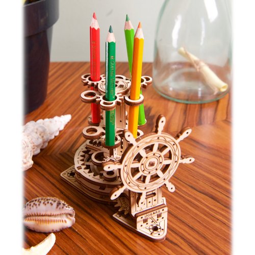 Jaký bude Váš příští kurz? Stavebnice organizéru psacích potřeb vyrobená z překližky. Ať už velíte druhým, nebo jste vlastními pány, s organizérem budete moci práci bezpečně kontrolovat. Pomocí velkého kormidla můžete otáčet kolečkem s nabídkou svých tužek, pastelek, propisek, či štětců. Přitom můžete podrobně sledovat práci planetového soukolí, pomyslného srdce mechanismu. Stavba modelu je nenáročná, a je proto vhodná k relaxaci, nebo i pro menší děti, které u ní mohou pod dohledem dospělých prověřit své dovednosti. Zážitek ze sestavování modelu pak můžete umocnit a prodloužit tím, že se jej pokusíte zkompletovat bez použití návodu. Organizér je samozřejmě také možno individuálně vybarvit pomocí akvarelových barev. Vybaveno detailním návodem k sestavení. Hlavní vlastnosti:51 precizně vyřezaných dílkůnízká obtížnost sestavení6 pozic k uložení psacích potřebnavrženo a vyrobeno na Ukrajině