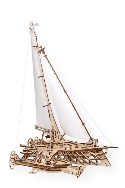 S větrem v zádech. Stavebnice trimaránové plachetnice vyrobená z překližky. Vyznavači štíhlých tvarů ocení překvapivě věrnou, propracovanou konstrukci přetékající detaily, kterou korunují zářivě bílé kosé plachty. Model oplývá mimořádným množstvím mechanických detailů, ať už jde o kormidlo, ovládání ráhen a naviják, s jehož pomocí vztyčíte vlajku o vlastním dekoru, nebo detail člunových jeřábů. Plachetnice je díky konstrukci na rovné ploše bezpečně stabilní, součástí balení je ovšem i zdobený stojan. Vybaveno detailním návodem k sestavení. Hlavní vlastnosti: 237 precizně vyřezaných dílkůvysoká obtížnost sestavenísvinutelné plachtovívelké množství dalších mechanických detailůšablony pro dekorování vlajkynavrženo a vyrobeno na Ukrajině