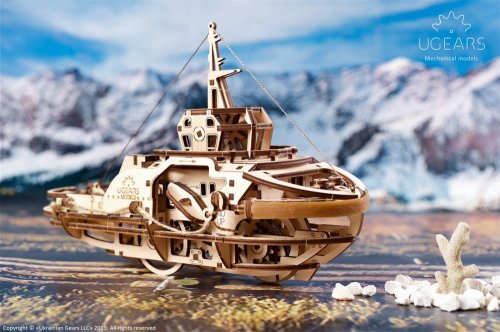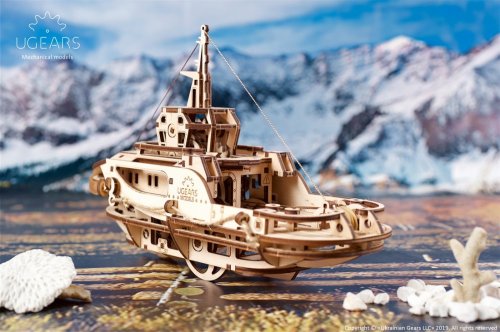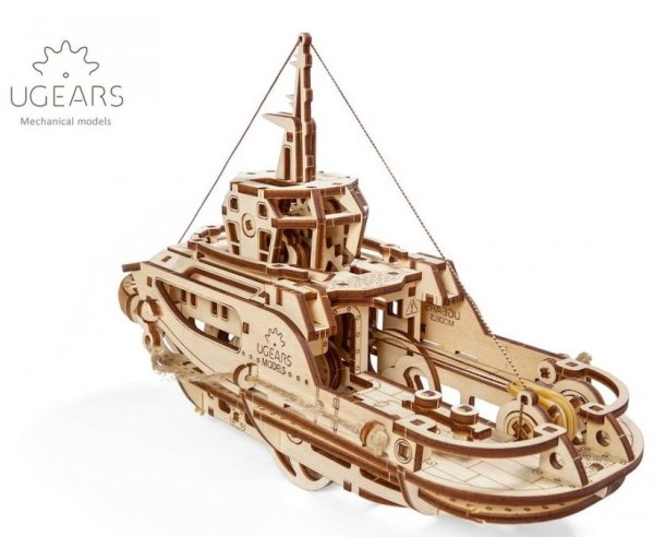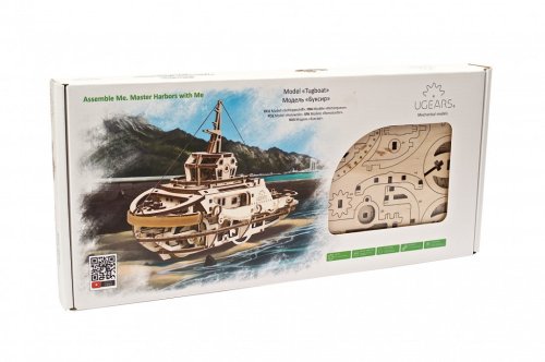 Stavebnice mechanického modelu remorkéru se skládá ze 169 dílů vyrobených z vysoce kvalitního dřeva a obsahuje vše, co budete potřebovat k sestavení (včetně nití, háčků a lan). Kvalita dílů je prvotřídní: pro řezání předmětů z překližkové desky se používá laserová metoda, která zajišťuje přesné rýhy detailů. Jednotlivé díly lze snadno vytlačit z desek a spojit bez použití lepidla či speciálního nářadí pomocí přiloženého návodu, který je součástí balení.Remorkér je poháněn gumovým motorem, který je poháněn napětím gumy spojené s ložiskem. Redukční převodovka přenáší energii na hnací kolo a dále na asymetrickou dvojici kol. Kyvadlo zpomaluje a vyrovnává pohyb remorkéru. Asymetrie dvojice kol propůjčuje modelu jedinečný způsob pohybu, který napodobuje loď houpající se na vlnách, zatímco pracovní kyvadlo vytváří specifický hluk podobný hluku, který vydává skutečný dieselový motor, kterým je mnoho lodí vybaveno. Navíjecí klíč na hnacím kole je blokován ráčnovým ozubeným kolem. K dispozici jsou dvě ovládací páky, z nichž jedna zastaví mechanismus a druhá ho spustí – stopovací a startovací páka. Pomocí dvou lan s háky zahákněte a přepravte malý náklad – např. modely na kolech nebo papírovou loď. Váš sestavený remorkér bude jezdit od 1,5 do 3 metrů v závislosti na typu povrchu. Přístav je bránou moře. Otevřete tuto bránu, připravte se na cestu, staňte se pánem přístavu se svým novým sladkým a spolehlivým remorkérem od firmy Ugears. Hlavní vlastnosti: 169 precizně vyřezaných dílkůkvalitní materiál a zpracovánívhodné od 14+ věkulehká obtížnost sestavení přibližně 2,5 hodinrozvíjí jemnou motoriku, trpělivost a prostorovou představivostnávod k sestavení je součástí balenínavrženo a vyrobeno na Ukrajině