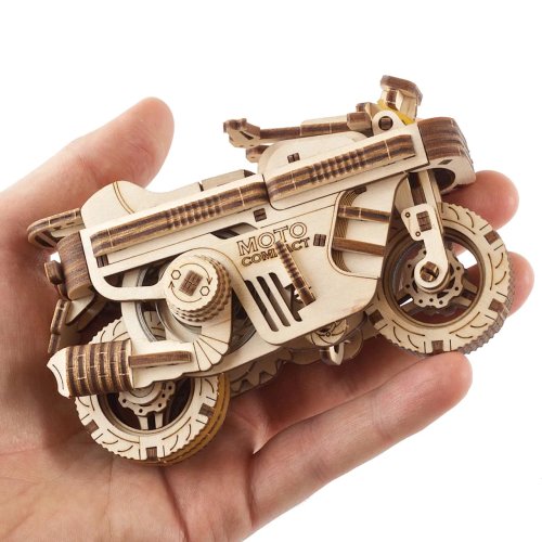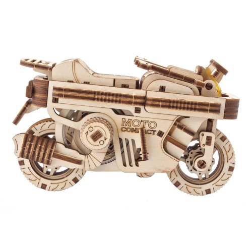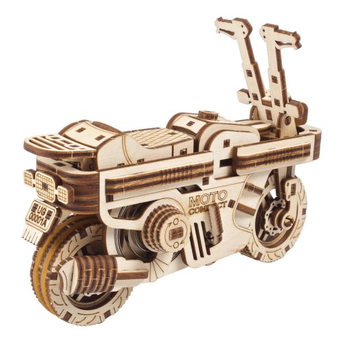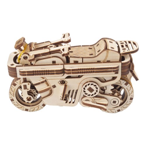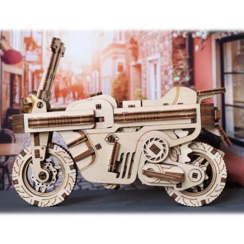 S větrem o závod! Stavebnice skládacího skútru vyrobená z překližky. Zakuste výzvu při stavbě jedinečného dvoustopého vozidla a pocit svobody, když jej spustíte na dráhu. Vyniká důmyslnou kompaktní konstrukcí, která umožňuje sklopení choulostivějších částí modelu pro jeho snazší a bezpečnější transport, například v kapse batohu. Disponuje výkonným natahovacím pohonem, který zajišťuje kovová pružina s dlouhou životností. Na jedno natažení model urazí až dva metry. Jednoduchou spouští za sedadlem můžete ovládat start a natočením řídítek také směr jeho jízdy. K jisté jízdě do zatáčky je skútr vybaven výsuvnými opěrnými kolečky. Atraktivitě mechaniky modelu přispívají odpružené nápravy, které zároveň s pogumovaným zadním kolem zlepšují kontakt s dráhou. Tvůrci při návrhu mysleli i na takové detaily, jako jsou výklopné stupačky, výsledek tak jistě potěší každého pravověrného nadšence modelářství a motocyklů. Nezapomeňte nakonec uspořádat závody i s dalšími modely UGEARS! Vybaveno detailním návodem k sestavení. Hlavní vlastnosti:192 precizně vyřezaných dílkůnízká obtížnost sestavenívýsledný model je řiditelný a schopný samostatné jízdynavrženo a vyrobeno na Ukrajině
