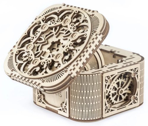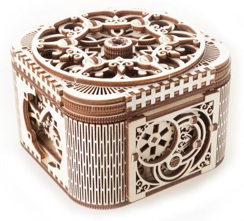 Mechanický drahokam. Stavebnice šperkovnice vyrobená z překližky. Uchvátí Vás svým vyřezávaným víkem a postranními okýnky odhalujícími uhrančivou hloubku svého mechanického tajemství. Její otevření je malým rébusem, kterým můžete ozvláštnit dárek vysoké reálné, či sentimentální hodnoty. Pootočením víka uvolněte nenápadný klíč, který vložte do čela šperkovnice a jeho otáčením pak skříňku otevřete. Vybaveno detailním návodem k sestavení. Hlavní vlastnosti: 190 precizně vyřezaných dílkůstřední obtížnost sestaveníúložný prostornavrženo a vyrobeno na Ukrajině