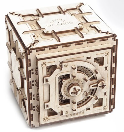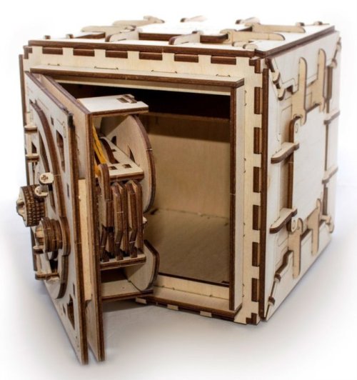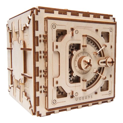 Zkouška Vašeho důmyslu. Stavebnice trezoru vyrobená z překližky. Do úložného prostoru o rozměrech 15x14x10 cm lze uschovat cennosti i drobné listiny, k zabezpečení slouží trojmístný číselný kód uživatelsky zadaný při sestavení. Pohyb propracovaného mechanismu můžete pozorovat několika okýnky. K otevření zadejte první číslici otáčením proti směru hodinových ručiček, druhou ve směru opačném, vpravo, a nakonec třetí opět otáčením doleva. Trezor zamknete prostým otočením číselníku doleva. Pokuste se prolomit kombinaci pomalým otáčením číselníku a pečlivým poslechem pohybů stavítka! Vybaveno detailním návodem k sestavení. Hlavní vlastnosti: 179 precizně vyřezaných dílkůvysoká obtížnost sestavenítrojmístný, uživatelsky volený kódrozměrný úložný prostornavrženo a vyrobeno na Ukrajině