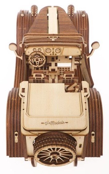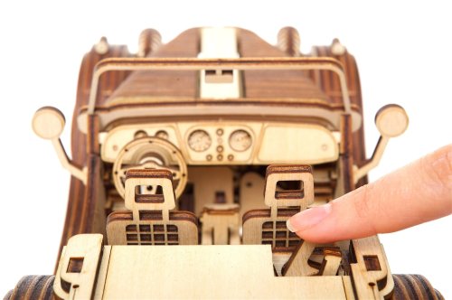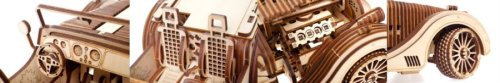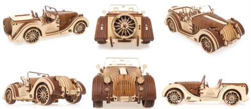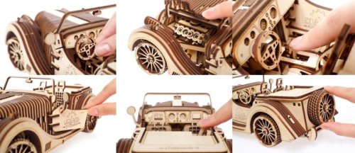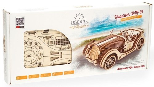 Milovníkům rychlosti a starých časů. Stavebnice autoveteránu typu roadster vyrobená z překližky. Model disponuje otevíracími dveřmi a odklopnou kapotou. Mechanika je do detailu propracovaná, a vy tak můžete pozorovat pohyb pístů motoru. Vůz je řiditelný a díky natahovacímu mechanismu je schopen jízdy, na jedno natažení urazí až 4 m. Má také funkční převodovku pro volnoběh a zpátečku. Uspořádejte závody s dalšími modely UGEARS! Vybaveno detailním návodem k sestavení. Hlavní vlastnosti: 437 precizně vyřezaných dílkůvysoká obtížnost sestaveníotevírací dveře a kapotavýsledný model je řiditelný a schopný samostatné jízdy včetně zpátečkynavrženo a vyrobeno na Ukrajině