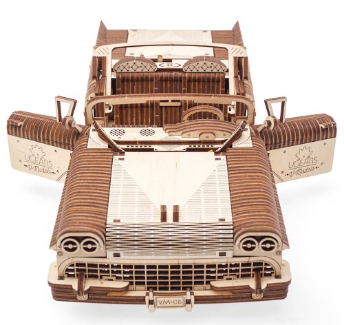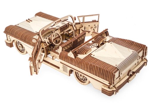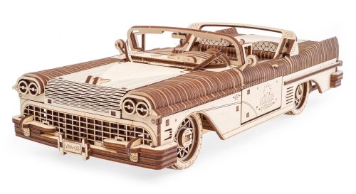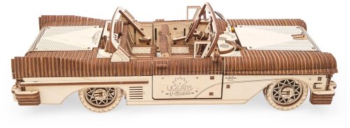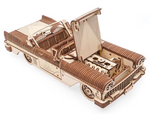 Vyrazte do autokina za rytmů rockabilly hudby. Stavebnice vozu typu convertible vyrobená z překližky. Disponuje volně uloženými detaily, za zadními blatníky naleznete kufřík s nářadím a zvedák. Mechanika je do detailu propracovaná, a vy tak můžete pozorovat pohyb ventilátoru chlazení a pístů motoru V8. Model se může pyšnit dalšími mechanickými podrobnostmi, funkčními stěrači, výsuvnými okénky dveří, sklopnými zadními sedačkami a dalšími. Vůz je řiditelný a díky natahovacímu mechanismu je schopen jízdy. Má funkční převodovku pro volnoběh a zpátečku. Jízdní dynamice slouží odpružené závěsy kol. Uspořádejte závody s dalšími modely UGEARS! Vybaveno detailním návodem k sestavení. Hlavní vlastnosti: 739 precizně vyřezaných dílkůvysoká obtížnost sestavenímnožství mechanických a volně uložených detailůodpružené závěsy kolvýsledný model je řiditelný a schopný samostatné jízdy včetně zpátečkynavrženo a vyrobeno na Ukrajině