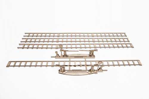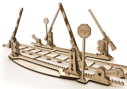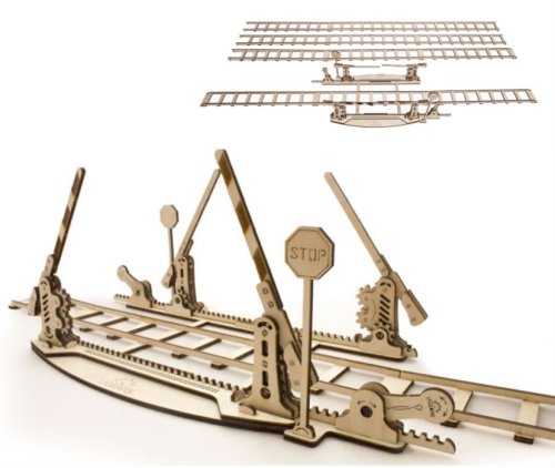 Sada dřevěných kolejí s pohyblivými závorami je skvělým doplňkem Ugears lokomotivy či vlakového nádraží. (Lokomotiva a nádraží nejsou součástí balení).