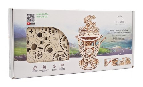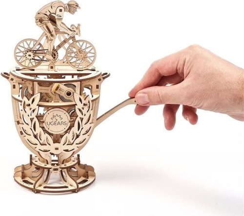 Ugears Cyklista stavebnice poháru s mechanickým cyklistou, vyrobená z překližky. Pohár se tvarem i detaily stane okrasou Vaší vitríny. Mechanický cyklista je uváděn do pohybu pomocí páky. Díky zvlášť uzpůsobené konstrukci můžete pozorovat pohyb propracovaného mechanismu a jeho chování dále upravovat plněním kapes v ramenech setrvačníku, které jsou vhodné zejména pro mince a žetony. Dřevo a pohyb - jak to jde dohromady? Jednoduše! Mechanický pohyb a tradiční materiál spojují 3D modely UGEARS. Poznejte tajemství převodů, gumičkových motorů, koleček a dalších mechanických součástek! Zábavné skládání bez nutnosti lepení, propracované detaily, hladký provoz a kvalitní zpracování - plně funkční pohyblivé 3D puzzle UGEARS ohromí i toho, kdo neměl fyziku ve škole právě v oblibě. Do detailu propracované dřevěné 3D skládačky ukrajinské značky UGEARS jsou vhodné nejen pro rozvoj motoriky a představivosti, ale jsou i neskutečně zábavné. Díky vysoké kvalitě výroby jsou při správné údržbě modely po sestavení plně funkční a pohyblivé a umožňují tak lépe poznat tajemství mechaniky. Rozměry složeného modelu: 24,5 x 17,5 x 12 cm 3D puzzle UGEARS jsou opatřeny podrobným obrázkovým návodem. UPOZORNĚNÍ: Pro správné fungování a bezproblémový provoz je třeba součástky, u kterých je to uvedeno v návodu (zejména osy), promazat voskem z obyčejné svíčky, aby byla rotace prováděna s minimálním třením Rozměr složeného puzzle cca 24,5 x 17,5 x 12 cm