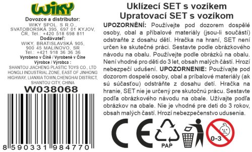 Úklidový set s vozíkem. Rozměry 33,5x31,5x71 cm. Vozík, lopatka velká, lopatka malá, smeták velký, smeták malý, smetáček, prachovka, stěrka na okna, mýdlo, 2 čistící prostředky ve spreji, podložka, pouzdro. varovná cedule. Obrázkový návod na složení na obalu.