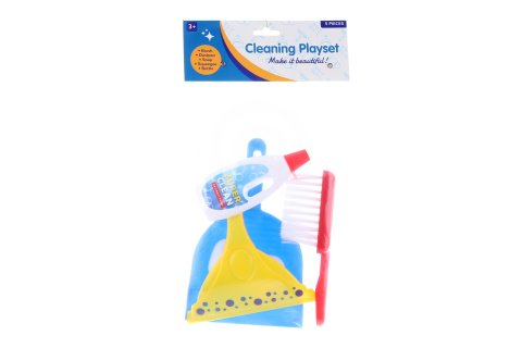 Uklízecí sada obsahuje smetáček, lopatku, stěrku, lahev na čistící prostředek a mýdlo. Materiál plast. Baleno v sáčku. Rozměry balení cca 18x32x7 cm. Věk 3+