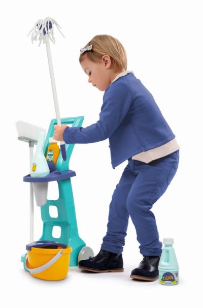 Vozík obsahuje veškeré potřebné náčiní: kbelík na úklid, mop, smeták, úklidové potřeby a ruční vysavač. Vozík pro domácnost je obzvláště lehký a ovladatelný, a proto jej lze vzít kamkoli. Tento úklidový vozík bohatý na detaily a bez ostrých hran je vhodný již pro děti od 3 let. Rozměry produktu (DxŠxV): 21 x 26,5 x 56 cm.