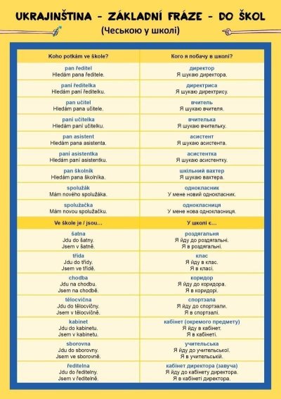 Tato naučná lamino kartička obsahuje základní fráze v ukrajinštině a zaměřuje se především na školní prostředí. Pomůže jak zájemcům o ukrajinštinu obecně, tak dětem pro lepší integraci v českých školách.