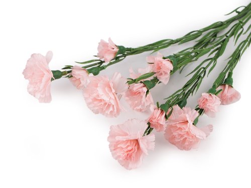 Kytice umělých mini karafiátů vynikne ve váze, ale jednotlivé stonky můžete v případě potřeby odstřihnout a využít je třeba na věnce a jiné dekorace. Uvnitř je drát, díky kterému je můžete různě tvarovat.
