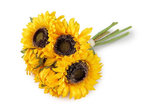 Svazek umělých slunečnic vynikne ve váze, v květinových vazbách, podzimních aranžmá a jednotlivé stonky s květy můžete zakomponovat i do dekoračních věnců. Slunečnice jsou působivě zabarvené. Uvnitř stonků je drát. Ve svazku je 8 stonků - 3 malá poupata a 5 velkých květů.