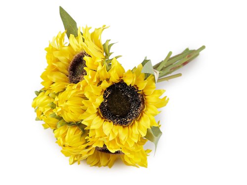 Svazek umělých slunečnic vynikne ve váze, v květinových vazbách, podzimních aranžmá a jednotlivé stonky s květy můžete zakomponovat i do dekoračních věnců. Slunečnice jsou působivě zabarvené. Uvnitř stonků je drát. Ve svazku je 8 stonků - 3 malá poupata a 5 velkých květů.