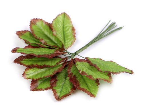 Větvička listů je skoro jako živá. Jednotlivé lístky mají ve stonku drát, díky kterému je můžete tvarovat. 12 listů je spojených do 1 svazku, ale dají se vytáhnout a používat jednotlivě. Použití: Listy se budou vyjímat na dekoračních věncích, v květinových vazbách, ikebanách nebo v aeráriích. Jsou vhodné také na zdobení čelenek do vlasů. Využijete je na dotvoření vlastních květů.