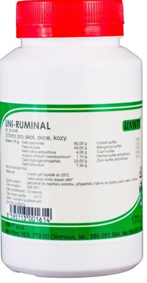 UNI-RUMINAL plv. je schválený veterinární přípravek, je to podpůrný a sílící prostředek pro přežvýkavce. Obsah a vzájemné poměry uvedených složek jsou významné pro vytvoření optimálního prostředí pro pomnožení mikroflóry a mikrofauny v bachoru, dále pro správnou motoriku předžaludků, pro zajištění potřeby a produkci vitamínů B. Přípravek přispívá k úpravě poruch energetického metabolismu a zajišťuje obnovu užitkových schopností zvířete.