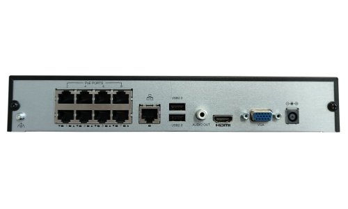 Porty: 1× HDMI 4K výstup, 1× VGA Full HD výstup, 2× USB 2.0, 8× RJ-45 (PoE podpora), 1× RJ-45 (10/100 Mbps), 1× audio výstup (RCA)