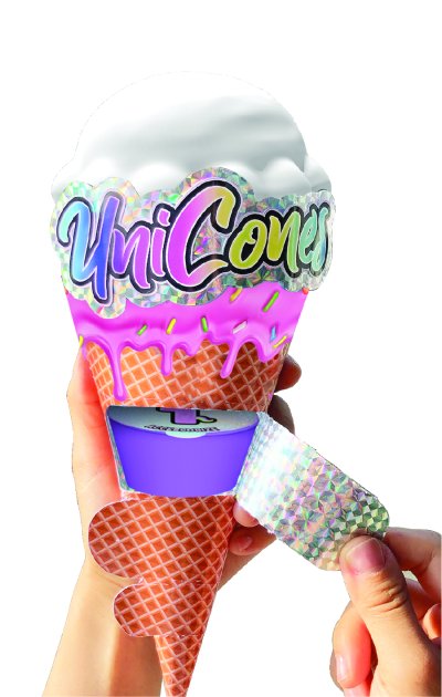 TV položkaPosbírej je všechny. V tomto kornoutu najdeš spoustu překvapení. Kortout se skládá ze 4 částí v nichž je ukryt jednorožec a úžasné doplňky, které si můžete vyměňovat. Samozřejmě nemůže chybět ani sliz.