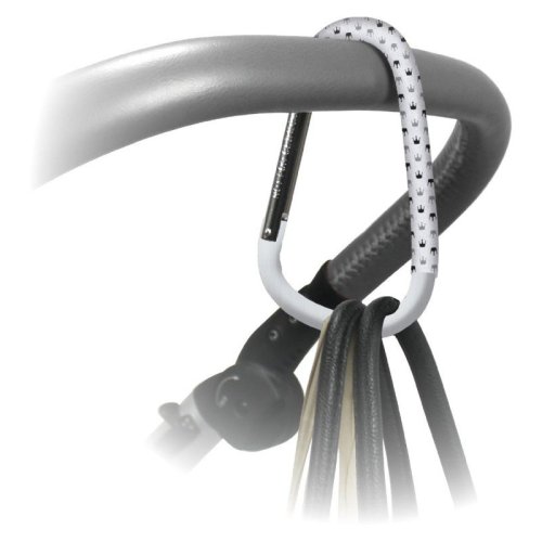Háček / karabina pro upevnění kabelky, batohu nebo přebalovací tašky na rukojeti kočárku či nákupním vozíku.