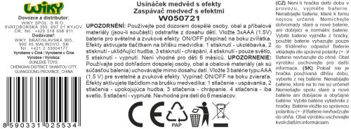 Usínáček medvěd. Velikost 29 cm. baterie 3xAAA nejsou součástí. Přepínač on/off na boku zvířátka. Stisknutím bříška se spouští zvukové efekty- 1. stisknutí ukolébavka, 2. stisknutí uklidňující hudba, 3. stisknutí chrápání, 4. stisknutí pouze světlo, 5. stisknutí vypnutí, 6. stisknutí - proměnlivý režim.