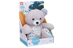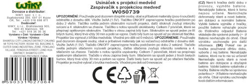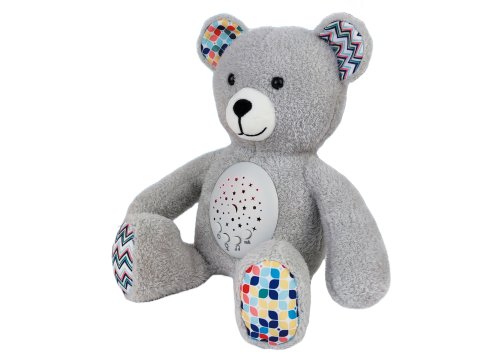 Usínáček s projekcí medvěd. Velikost 24cm. Baterie 3xAA nejsou součástí. Tlačítko ON//OFF přidržením po dobu 2s se zapne/vypne. Tlačítko světla jedním stisknutím rozsvítí projekci, další stisknutí zvyšují intenzitu svícení a 4.stisknutím se zhasne. Tlačítko s notou spouští ukolébavky. Celkem 7 písniček, které se přepínají opětovným stisknutím. Tlačítko s vlnou zapíná bílý šum. Stisknutím se spustí jeden ze tří bílých šumů, který trvá vždy 30min a poté se vypne. Další bílý šum se spustí až po stisknutí tlačítka. Projektor lze vyjmout z bříška medvěda.