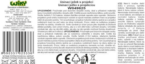 Usínací ježek s projekcí. Velikost 20 cm. Baterie 3xAAA nejsou součástí. Projektor na bříšku ježka svítí, hraje a otáčí se. Otočením projektoru proti směru hodinových ručiček se spustí ukolébavka a během hraní se projektor otáčí do původní polohy. Tím se hýbe i projekce hvězdné oblohy. Projektor jde vyjmout z bříška ježka. Dozadu projektoru se vkládají baterie. Projekce se zapíná tlačítkem.