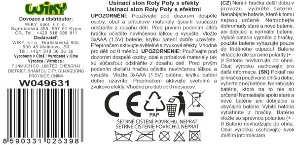 Usínací slon Roly Poly s efekty. Velikost 16 cm. Baterie 3xAAA nejsou součástí. Tlačítko on/off. Tlačítko na zvukové efekty. Světelné a zvukové efekty.