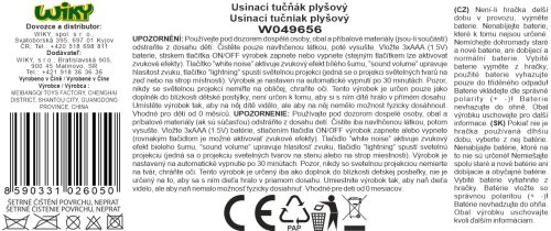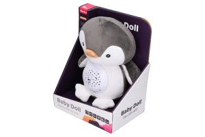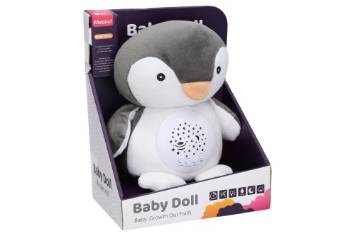 Usínací tučňák plyšový. Rozměry 26x12x25 cm. Funkce světla - 7 barev, mohou se automaticky měnit. 10 melodií, 4 bílý šum. Možnost nastavení hlasitosti. Automatické vypnutí po 30 minutách. 3xAAA baterie, nejsou součástí.