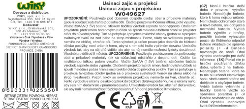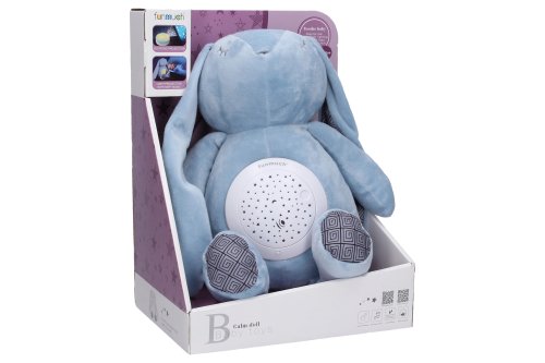 Usínací zajíc s projekcí. Velikost 26 cm. Baterie 3xAAA nejsou součástí. Projektor na bříšku zajíce svítí, hraje a otáčí se. Otočením projektoru proti směru hodinových ručiček se spustí ukolébavka. Projektor jde vyjmout z bříška zajíce. Dozadu projektoru se vkládají baterie. Projekce se zapíná tlačítkem.