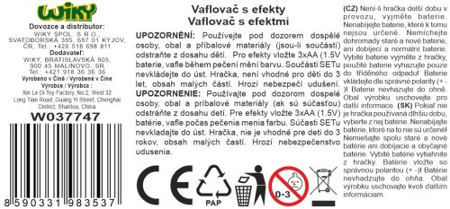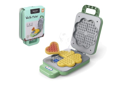 Vaflovač s efekty. Velikost 23 cm. Obsahuje vaflovač a 4 ks vaflí. Vafle během pečení změní barvu. Vydává světelné i zvukové efekty. 3xAA (1.5V) baterie nejsou součástí.