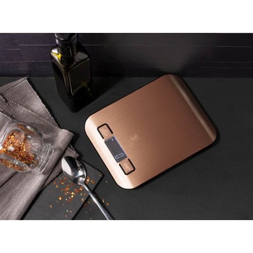 materiál: ABS + tvrzené sklo - LCD displej - kapacita 5 kg - funkce Tare umožňuje odečíst nádobu ve které je váženo - funkce automatického vypnutí při nečinosti - volitelné jednotky: G, LB, KG, OZ - elegantní design - rozměry: 19,5 x 14,5 cm - barva: růžovo zlatá metalická - kolekce Rosegold Metallic Line